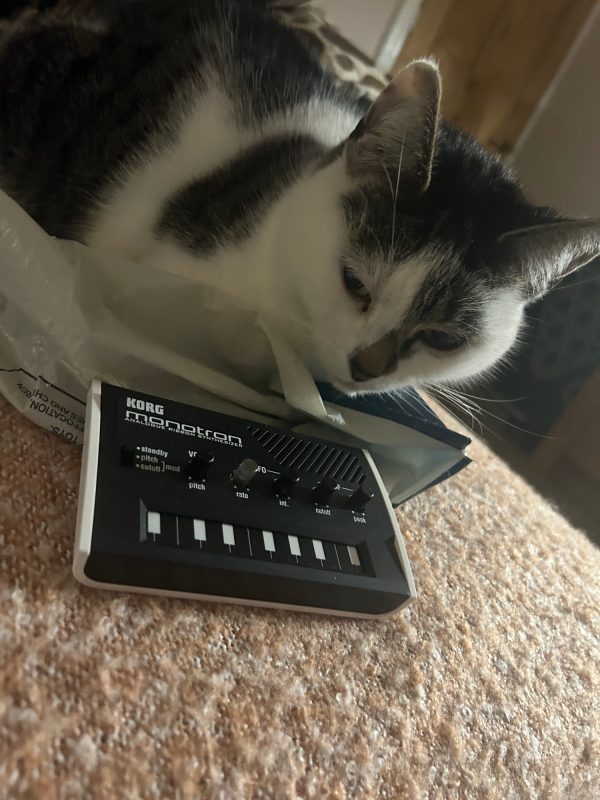 Bella and Korg Monotron The lovely Bella poses with an OG Korg Monotron. Submitted by Fishy808 via BlueSky.