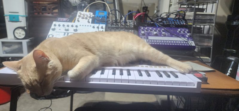 Finn is napping comfortably on top of a keyboard. Behind him, we see a Behringer TD-3 on the left, and a Behringer RD-6 (grape version) on the right. The blue pedal in the back is a Zoom MultiStomp.