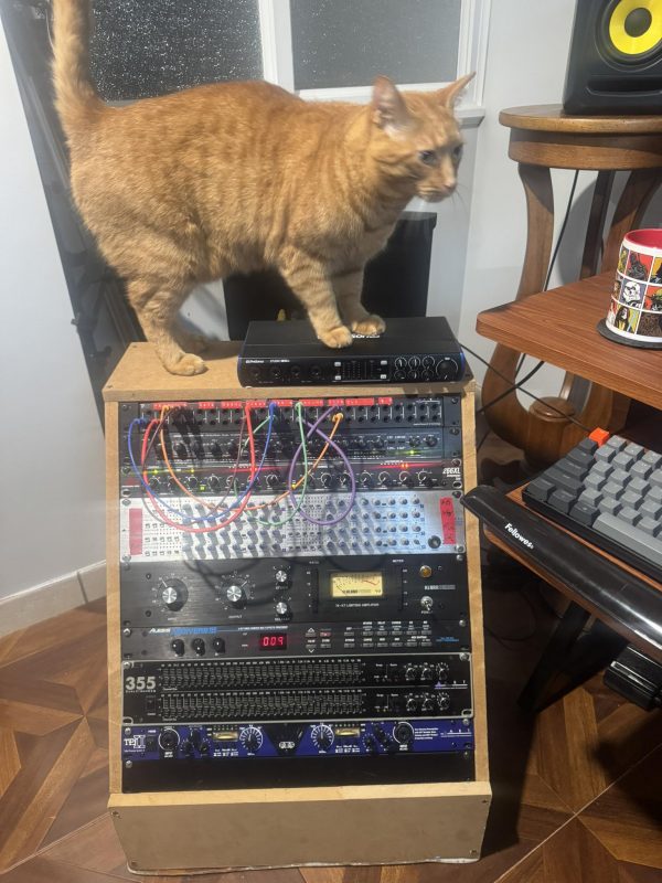 A cat helping out in the studio with various signal-processing units, including Klark-Technik LA-2A clone, a vintage Alesis MIDIVerb III, a couple of units from A.R.T., and more.
