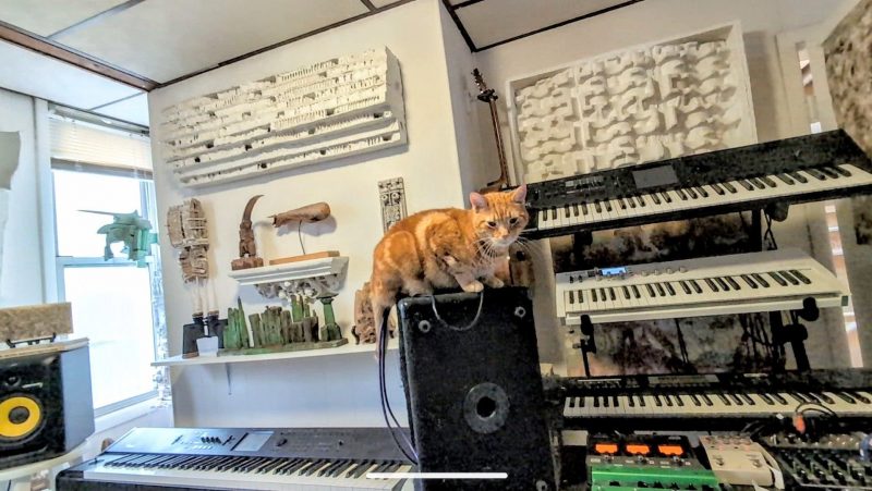 Ringo poses for us in the middle of “his” studio, which he shares with our friend Damien Olsen. We see multiple Korg keyboard synths, a Waldorf Blofeld, Line 6 pedal, and more. We also see some of Damien’s artwork hanging on the wall.
