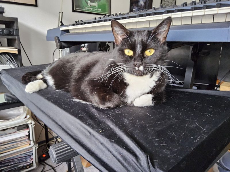 Suzy returns to CatSynth. She sits comfortably atop an Ensoniq ESQ-8, which is sporting a much-needed dust cover. Above her is a Roland JP-8000.