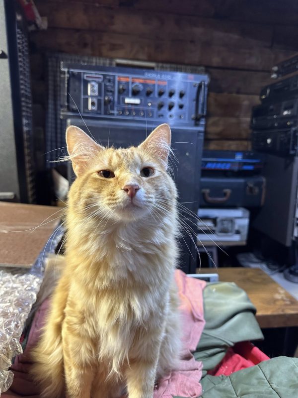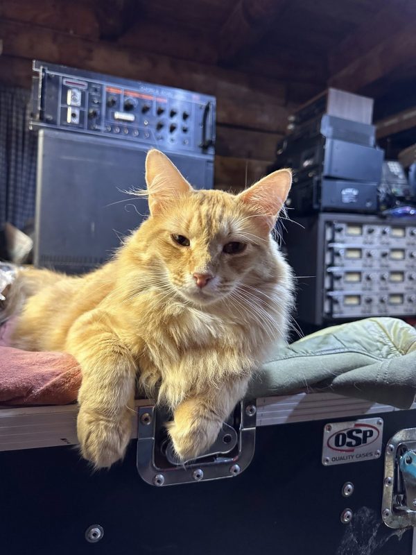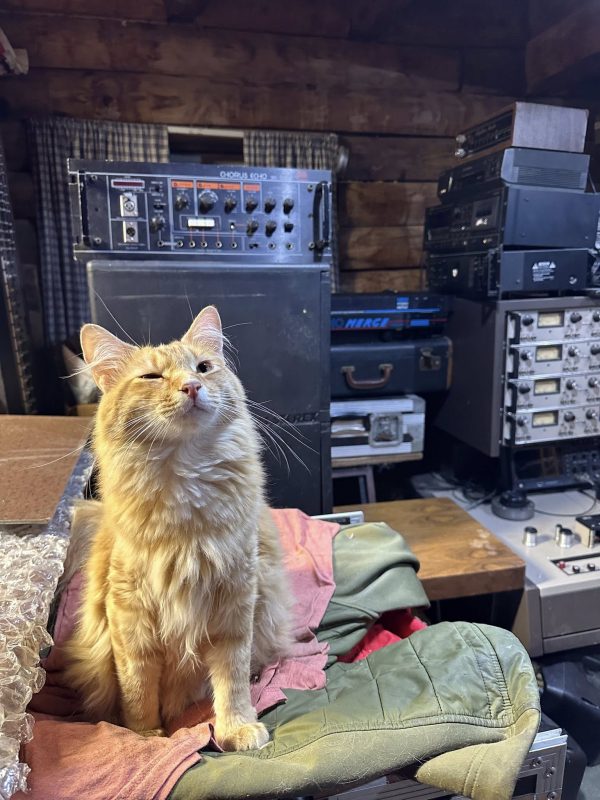 Hamlet, aka Ham/Hammy/Hamster, poses in front of a vintage Roland Chorus Echo SRE-555 and a vintage MCI JH-110 tape recorder with rackmount control units. Hamlet and his human, Charles Whiley, certainly know how to find these old gems.