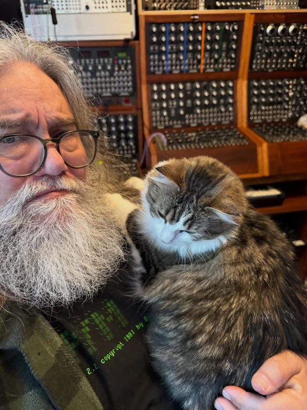 The lovely Subaru enjoys some cuddles with her human, Dave Fulton, as they pose for us in front of an impressive modular synthesizer setup. A beautiful image of cats, love, and synths!