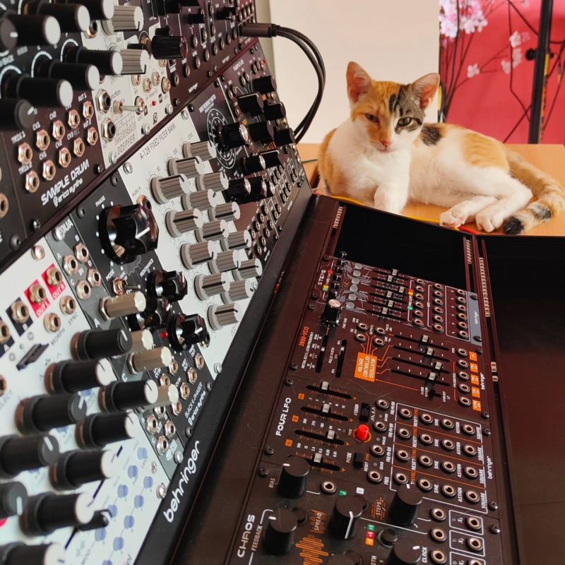 A beautiful cat poses with a large modular system, featuring modules from Behringer, Doepfer, Erica Synths, and more. I like how the cat matches the colors of the modular system.