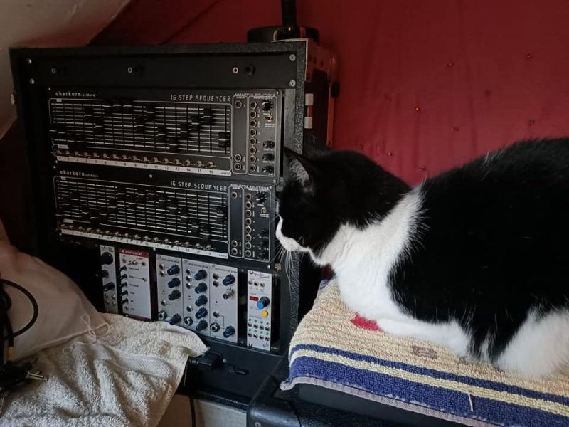 This is Goose – he hopped up on my Jupiter-50, my synth I use for live work, which is blocking my Rhodes and ARP Odyssey full-size reissue in Mark 2 livery, along with their pedalboards- while I program patches for my next gig.