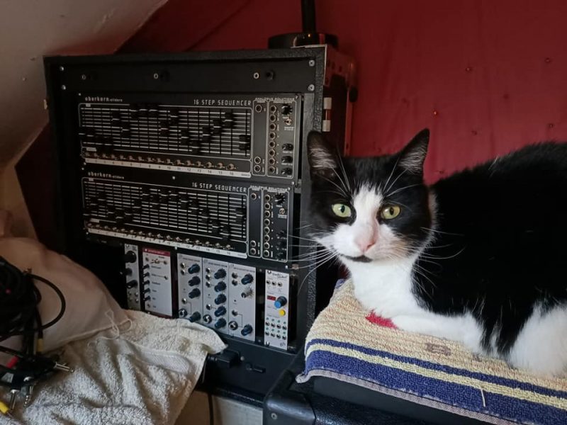 The synth to the left of the cat is a SOMA Laboratory Lyra-8. The keyboard is left as an exercise to the reader.