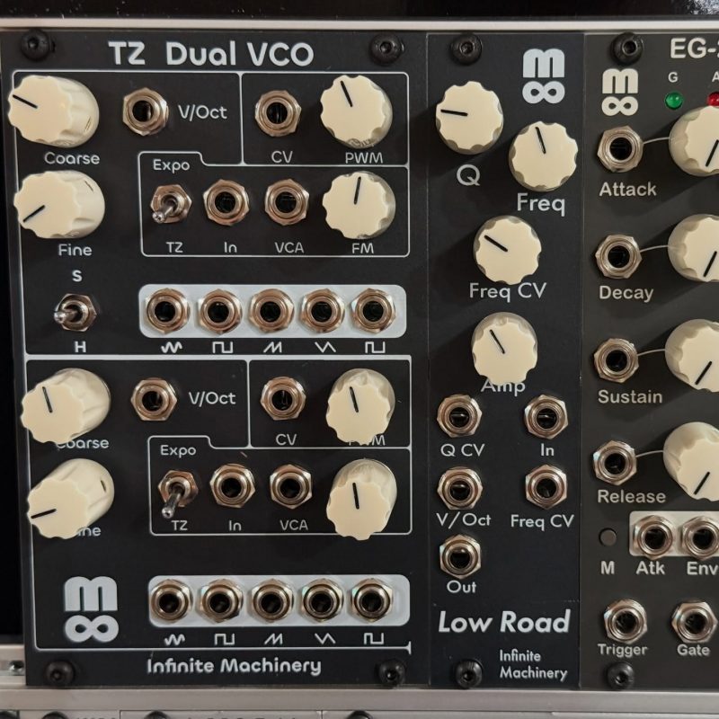 It appears the Infinite Machinery modules in question are the TZ (thru-zero) Dual VCO and Low Road filter.